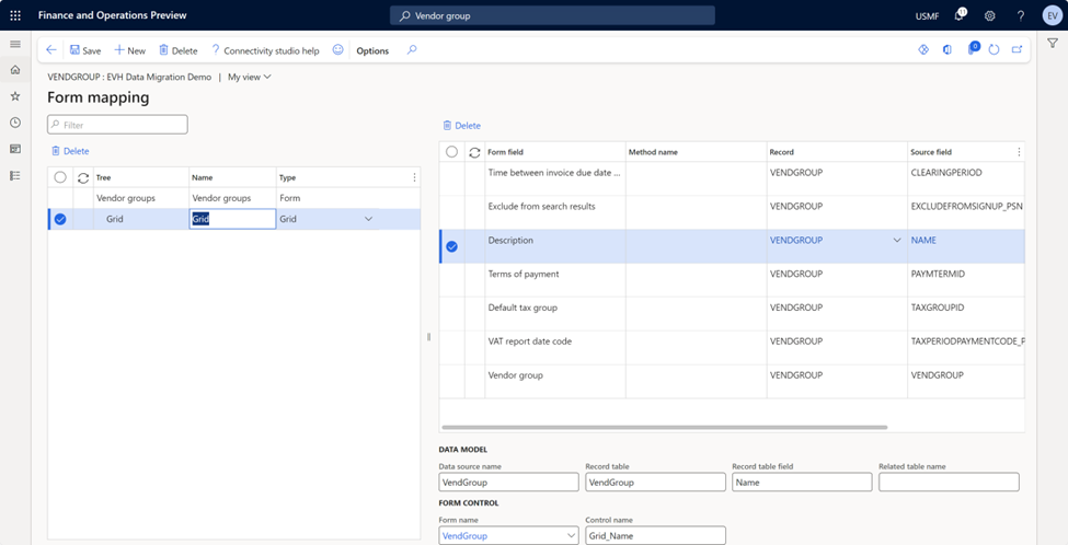 For example, you can open the vendgroup mapping and verify the missing fields.